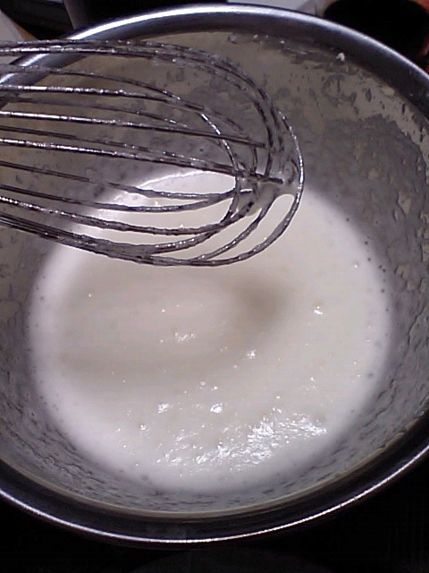チーズいれてー。コーンスターチいれてー。卵黄いれてー。